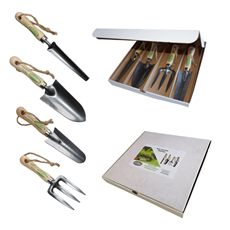 Zestaw tworzą poręczne i wytrzymałe narzędzia o zaoblonych głowicach z wysokiej jakości stali i profilowanych rączkach z lakierowanego drewna bukowego. Łopatki, widełki i wycinak idealnie sprawdzą się przy roślinach doniczkowych i małych rabatach.