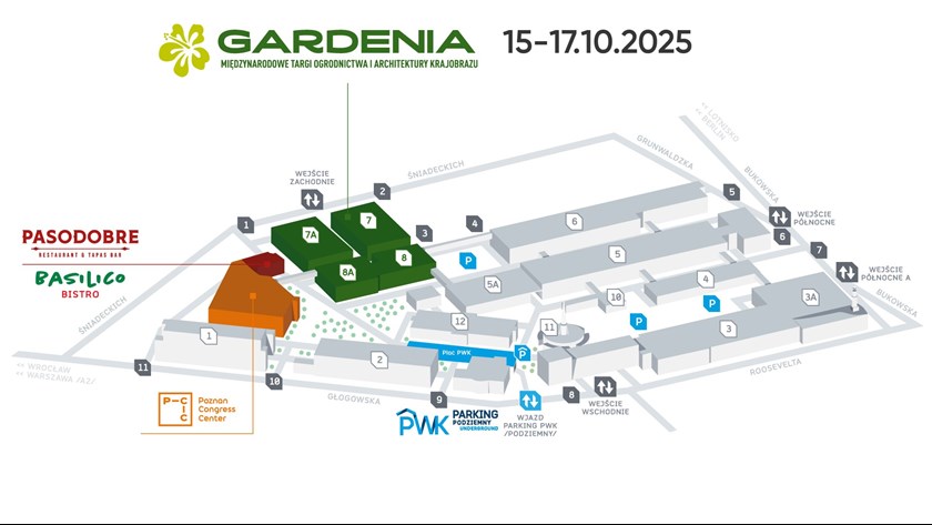 Targi GARDENIA odbywają się w pawilonach 7, 7A, 8 i 8A na terenie Międzynarodowych Targów Poznańskich.